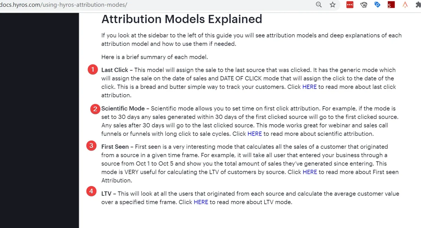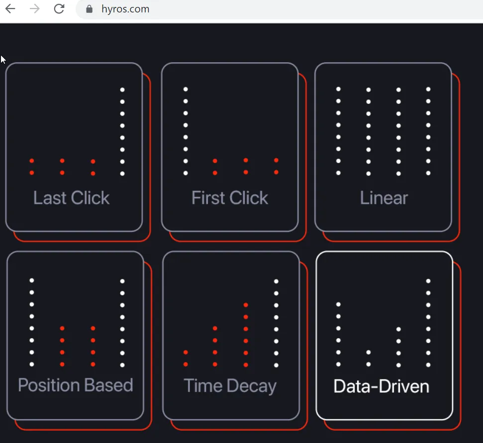 Contrary to what is advertised on Hyros website (six attribution models) and according to Hyros public documentation, there seem to be only four attribution modes.